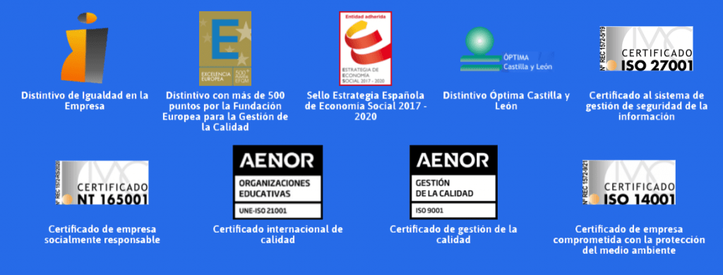- UNE-ISO 21001: Certificado internacional de calidad, que demuestra nuestra capacidad para apoyar la adquisición y el desarrollo de competencias a través de la enseñanza.