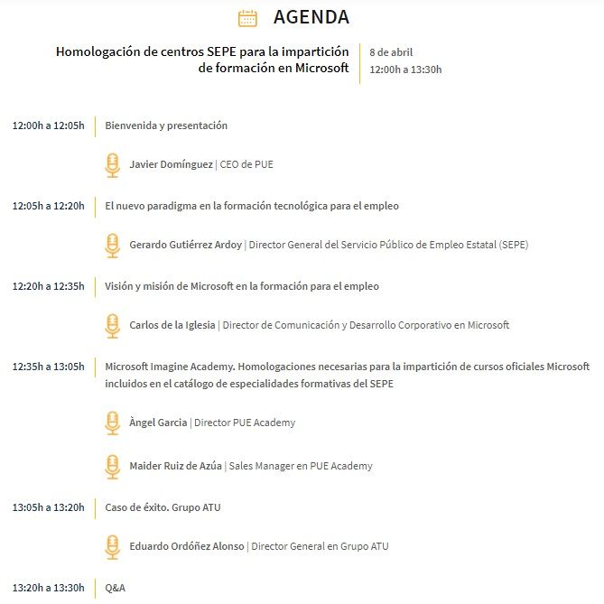 En él, participarán Gerardo Gutiérrez Ardoy, Director General del Servicio Estatal de Empleo Público (SEPE) y Carlos de la Iglesia, Director de Comunicación y Desarrollo Corporativo en Microsoft, quienes presentarán las líneas estratégicas establecidas por ambas organizaciones en la promoción de formación y certificación oficial para el empleo en el ámbito de la tecnología.